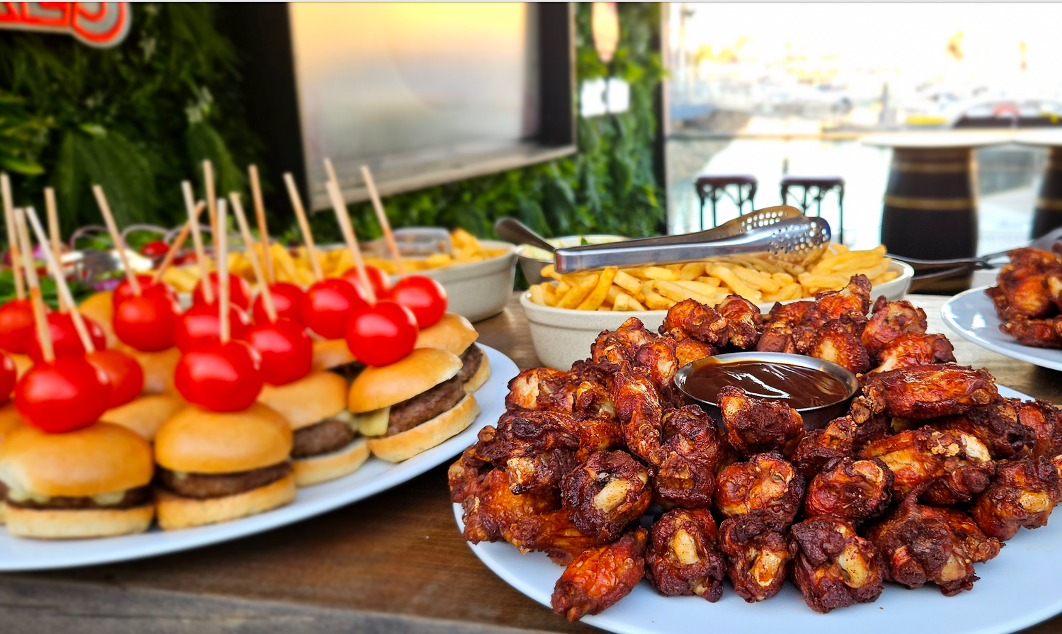 Cocktail sausages, Chicken Wings, Mini Burgers, Chips, Garlic Mushrooms, Onion Rings, Tempura Prawns, Chili Nachos, Garlic Bread, Fresh Salad & Coleslaw